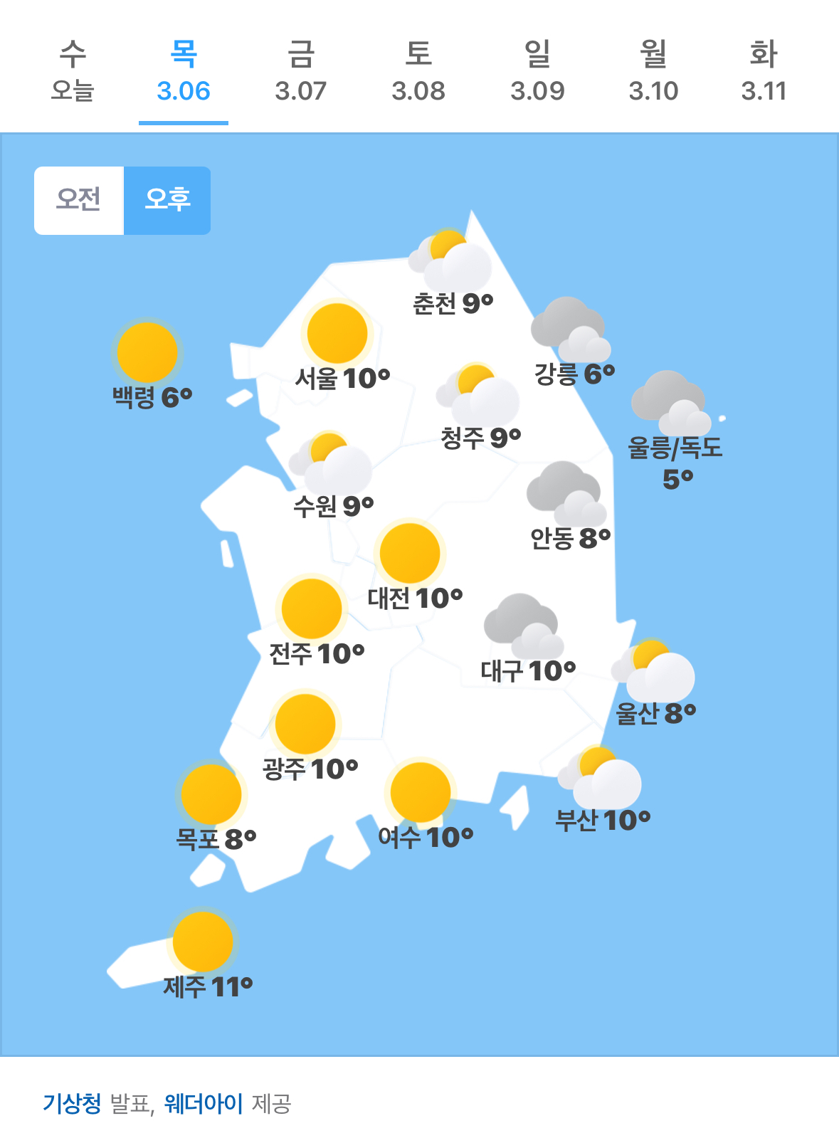 오늘의 날씨 🌞☔️☃️ , 2025년 3월 6일 목요일