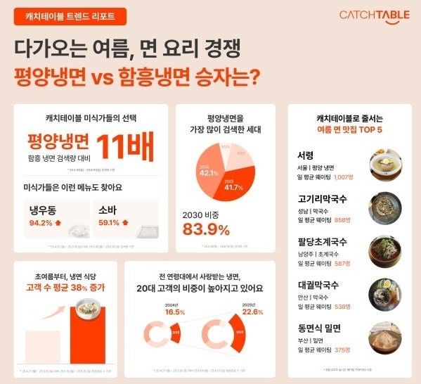 식당 예약 플랫폼 '캐치테이블'에 따르면 지난 5월 19일부터 지난달 15일까지 평양냉면의 검색량은 함흥냉면보다 11배 많았다.