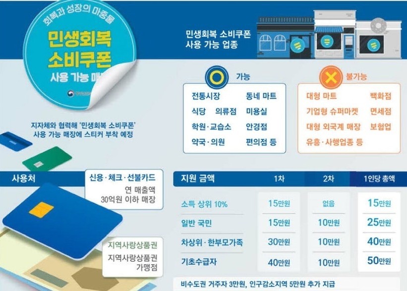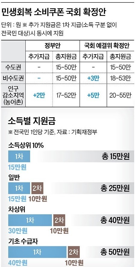 → 1차로 15만~45만원, 상위 10%를 제외한 국민들에게 2차로 10만원 추가 지급.