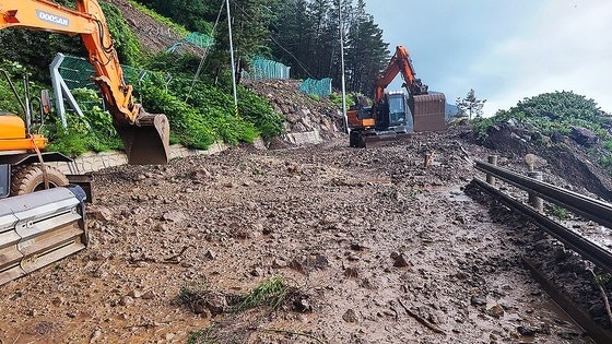 14일 경북 울릉군 현포리 노인봉 도로 구간에서 산사태가 발생 교통이 통제되고 있다. 울릉군=뉴스1