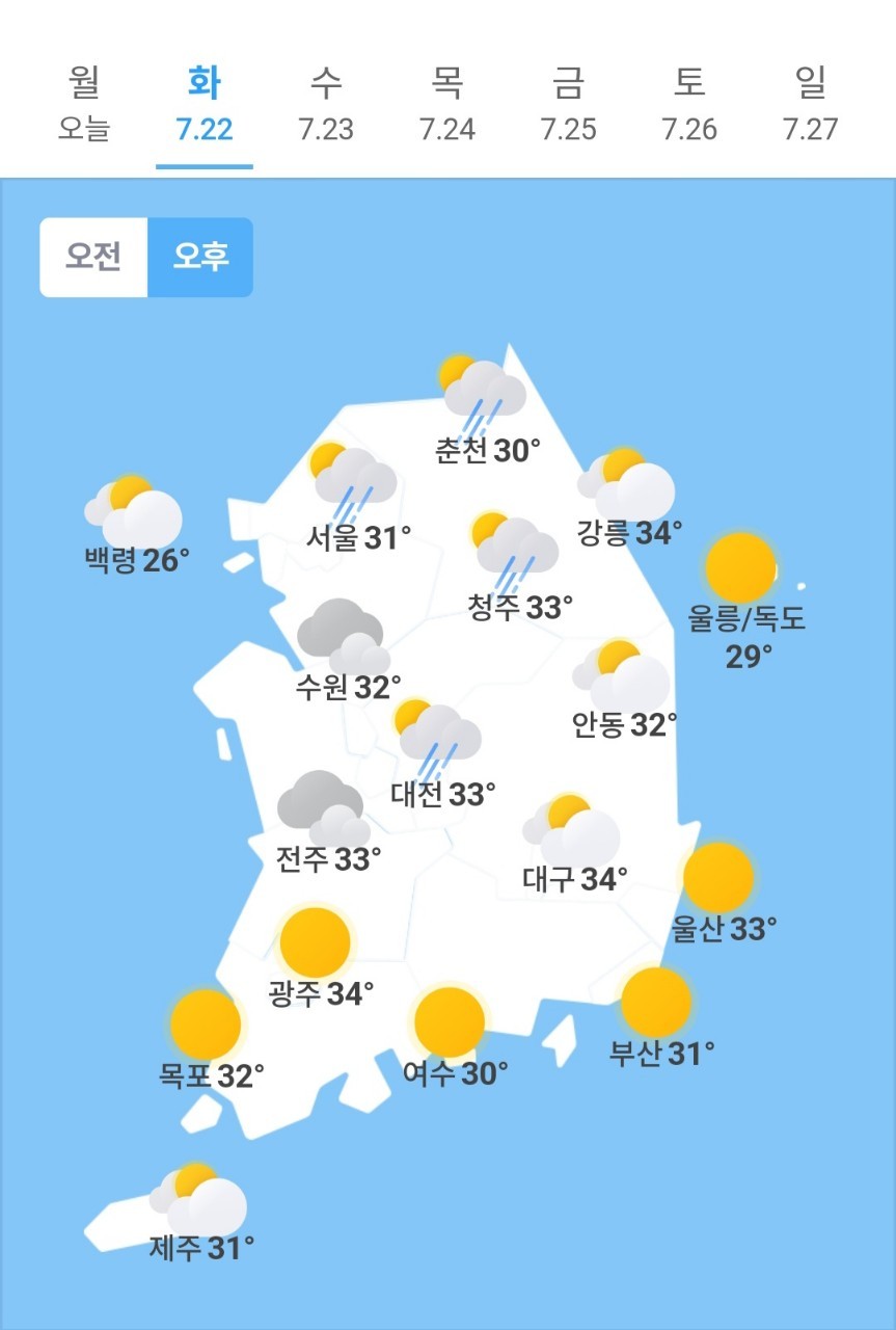 오늘의 날씨 🌞☔️☃️ , 2025년 7월 22일 화요일