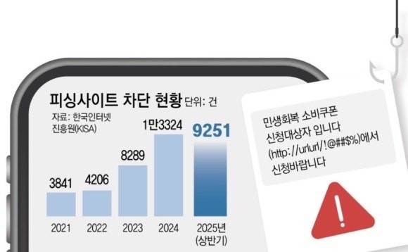 → 21일 민생회복 소비쿠폰이 지급 이후 사용자의 개인정보를 빼내거나 금전적 이익을⁸⁸ 노리는 가짜 웹사이트(피싱 사이트) 피해 잇따라. ‘지원금 신청’ 누르자 유료 서비스 가입 유도...(동아)▼.