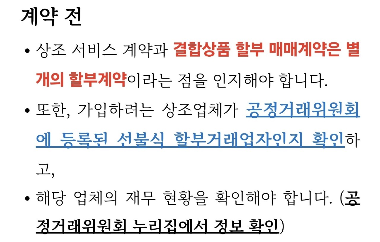 상조 가입할 때 상조 계약(만기 12~20년)과 별도로 가전제품 할부 매매계약(3~5년)을 맺어야 한다고. 공정위. ‘상조 계약을 체결하는 과정에서 상조 계약 외에 별개의 계약이 있는지 확인할 필요.(한국)
