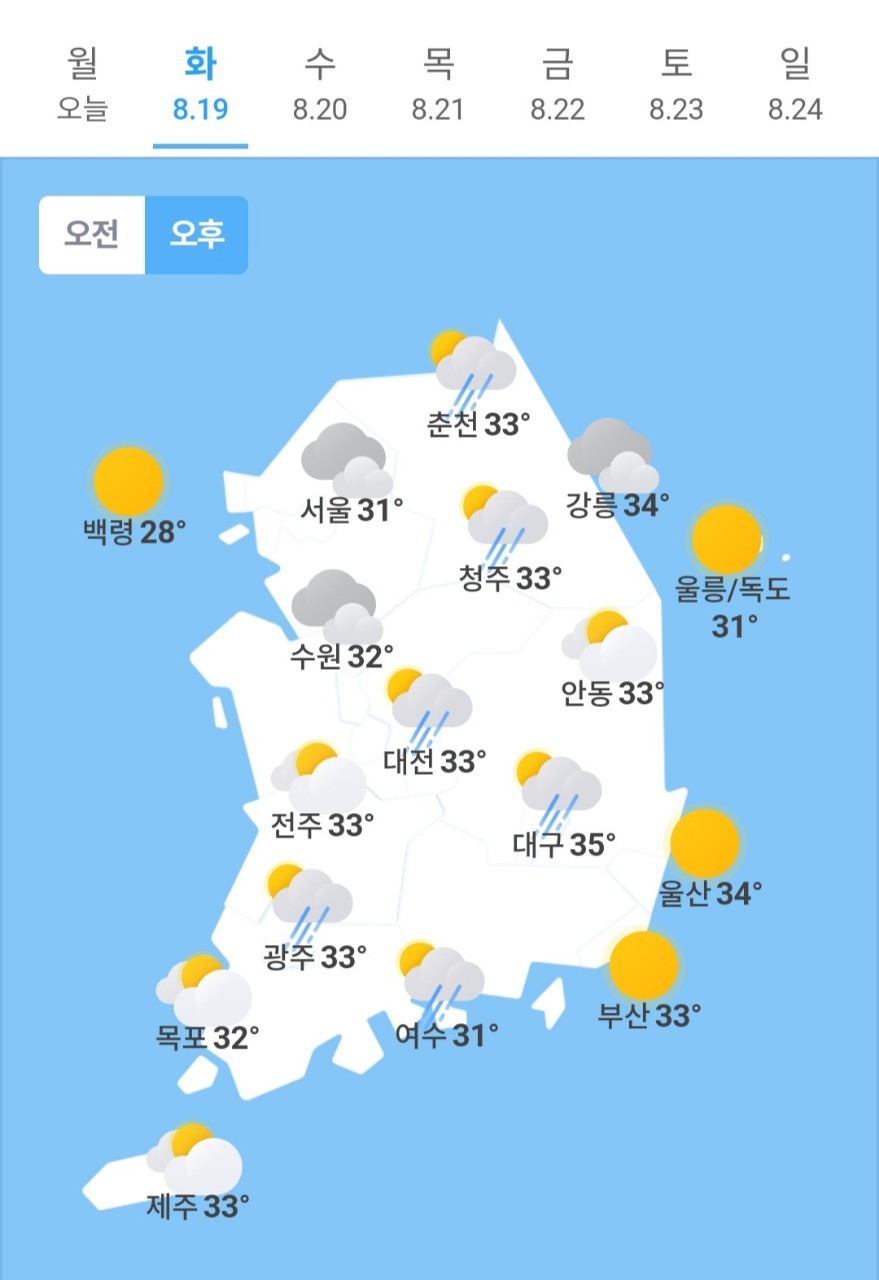 오늘의 날씨 🌞☔️☃️ , 2025년 8월 19일 화요일