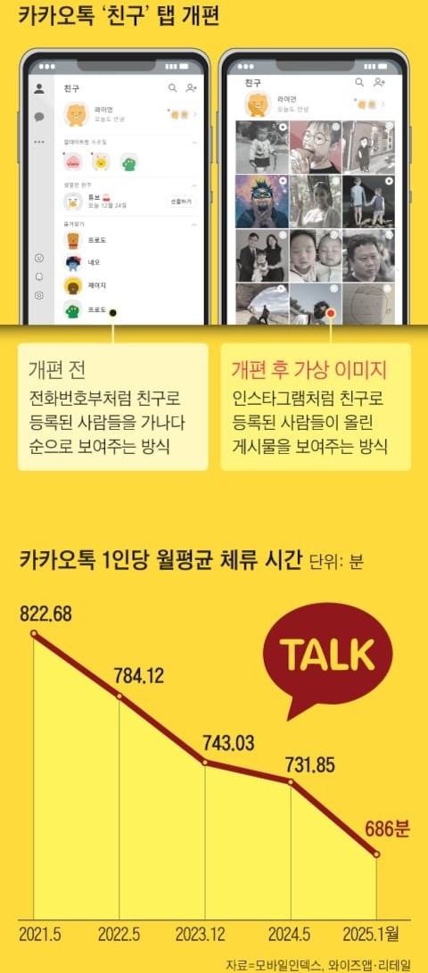 카카오가 다음 달부터 카카오톡 초기 화면인 ‘친구’ 탭을 인스타그램처럼 바꾼다.