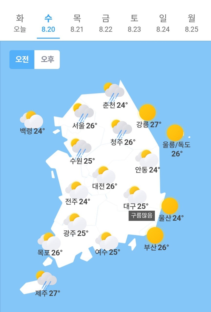 오늘의 날씨 🌞☔️☃️ , 2025년 8월 20일 수요일
