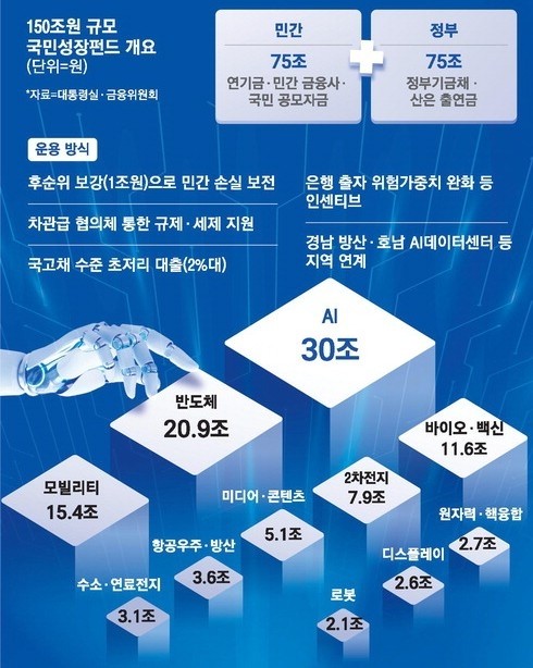 2. 정부가 민관 합동으로 150조원 규모의 국민성장펀드를 조성해 첨단전략산업을 키운다는 청사진을 제시했습니다.