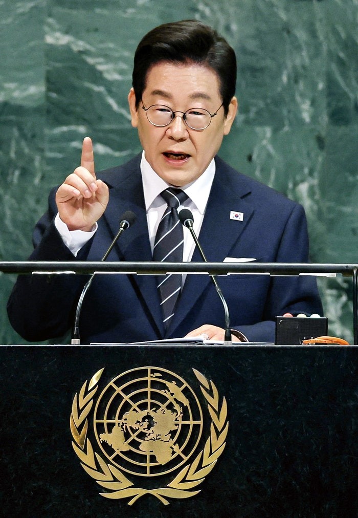 이재명 대통령이 23일(현지시간) 미국 뉴욕에서 열린 유엔총회에서 기조연설을 하고 있다.