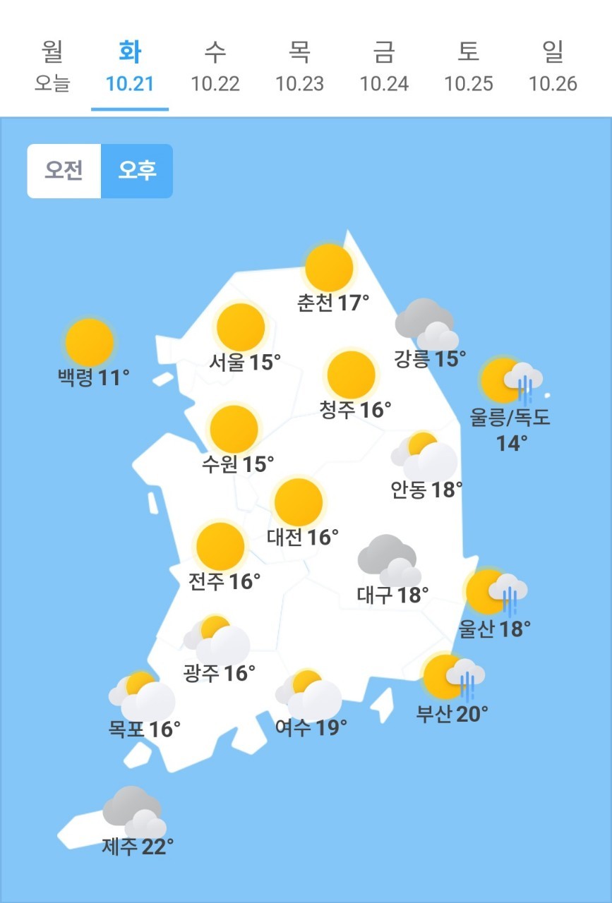 오늘의 날씨 🌞☔️☃️ , 2025년 10월 21일 화요일