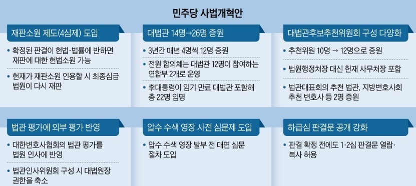 4. 더불어민주당이 대법관 수를 14명에서 26명으로 확대하는 내용을 골자로 하는 자체 사법개혁안을 발표했습니다.
