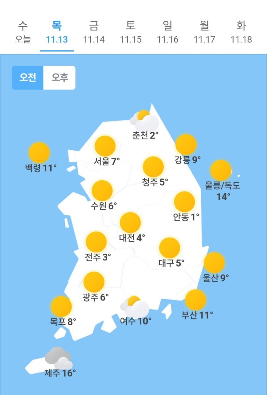 오늘의 날씨 🌞☔️☃️ , 2025년 11월 13일 목요일