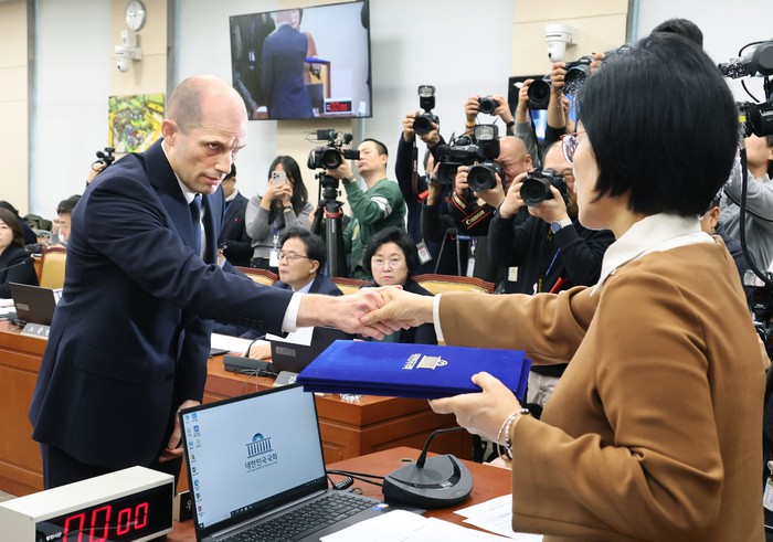 해롤드 로저스 쿠팡 임시 대표가 17일 국회 과학기술정보방송통신위원회에서 열린 쿠팡 침해 사고 관련 청문회에 증인 신분으로 참석해 선서한 뒤 최민희 위원장과 악수하고 있다.