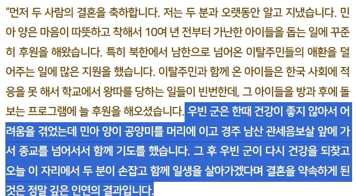 → ‘우빈 군은 한때 건강이 좋지 않아(비인두암) 어려움을 겪었는데, 민아 양은 공양미를 머리에 이고 경주 남산 관세음보살 앞에 가 종교를 넘어서 함께 기도를 했다... 정말 깊은 인연의 결과‘.(한경 외)