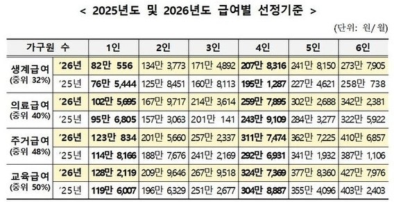 2025년도 및 2026년도 급여별 선정기준 (자료=복지부 제공)