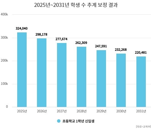 → 1학년 학생 수 2023년 40만 1752명에서 올해 입학할 신입생은 29만 8178명으로 추산.