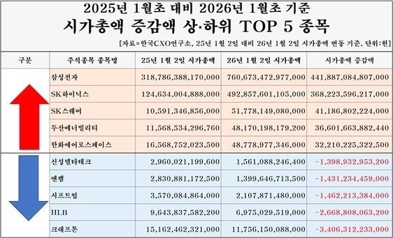 → 기업분석전문 한국CXO연구소에 따르면 국내 시총 규모는 2025년 1월 초 2254조원에서 올 1월 초 3972조원으로 1년 새 76.2%(1718조원) 증가.