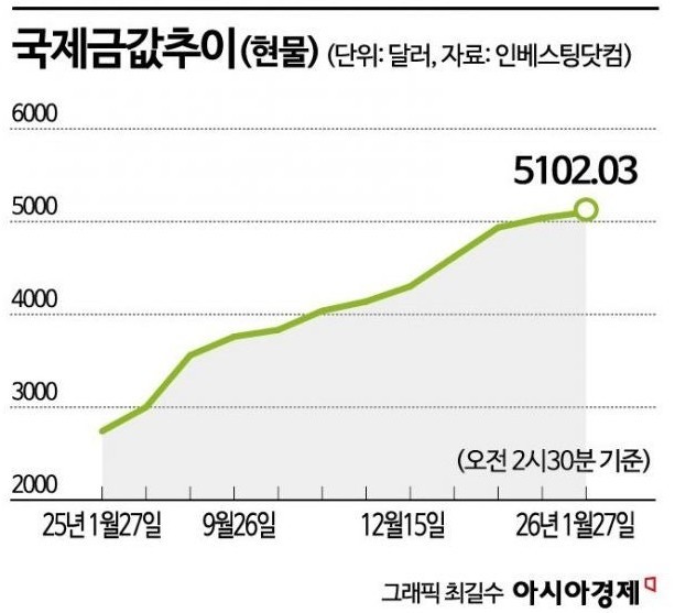 국제 투자은행들이 현재 온스당 5100달러인 금값 목표치를 5500달러에서 6000달러 선까지 상향...