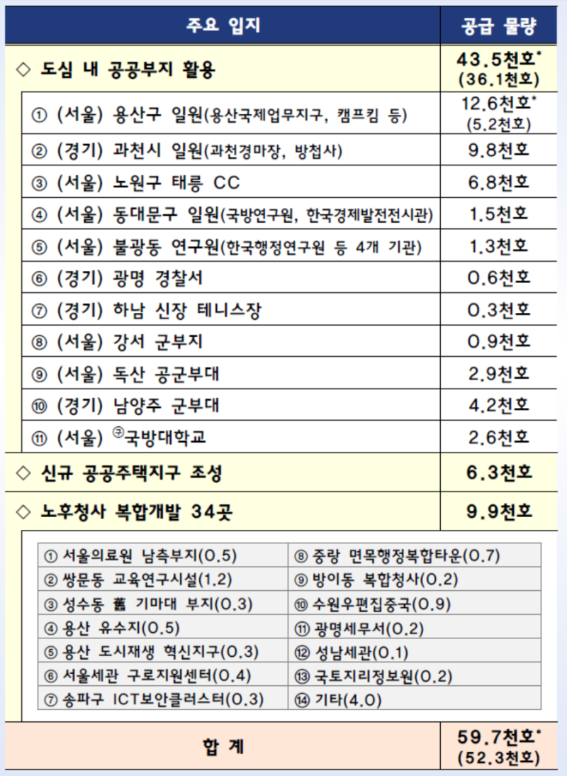 1. 정부가 서울 용산국제업무지구와 경기 과천 경마장·태릉CC 용지 등을 활용해 수도권 도심 최상급 입지에 6만가구 규모의 주택을 공급하기로 했습니다.