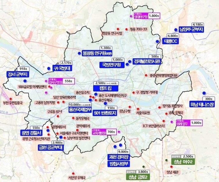 → 용산국제업무지구, 태릉 골프장, 과천 경마장 등 수도권 핵심 지역이 포함.