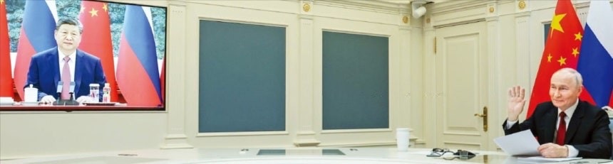 < 시진핑·푸틴 화상회담 > 블라디미르 푸틴 러시아 대통령이 4일(현지시간) 크렘린궁에서 시진핑 중국 국가주석과 화상회담을 하고 있다. 회담은 1시간25분간 이뤄졌다. 시 주석은 이후 도널드 트럼프 미국 대통령과 전화통화를 했다. /EPA연합뉴스