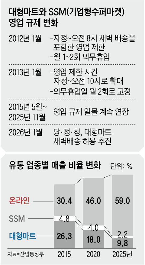 1. 당정이 대형마트의 새벽 배송을 허용하는 방향으로 유통산업발전법 개정을 검토하고 있습니다.