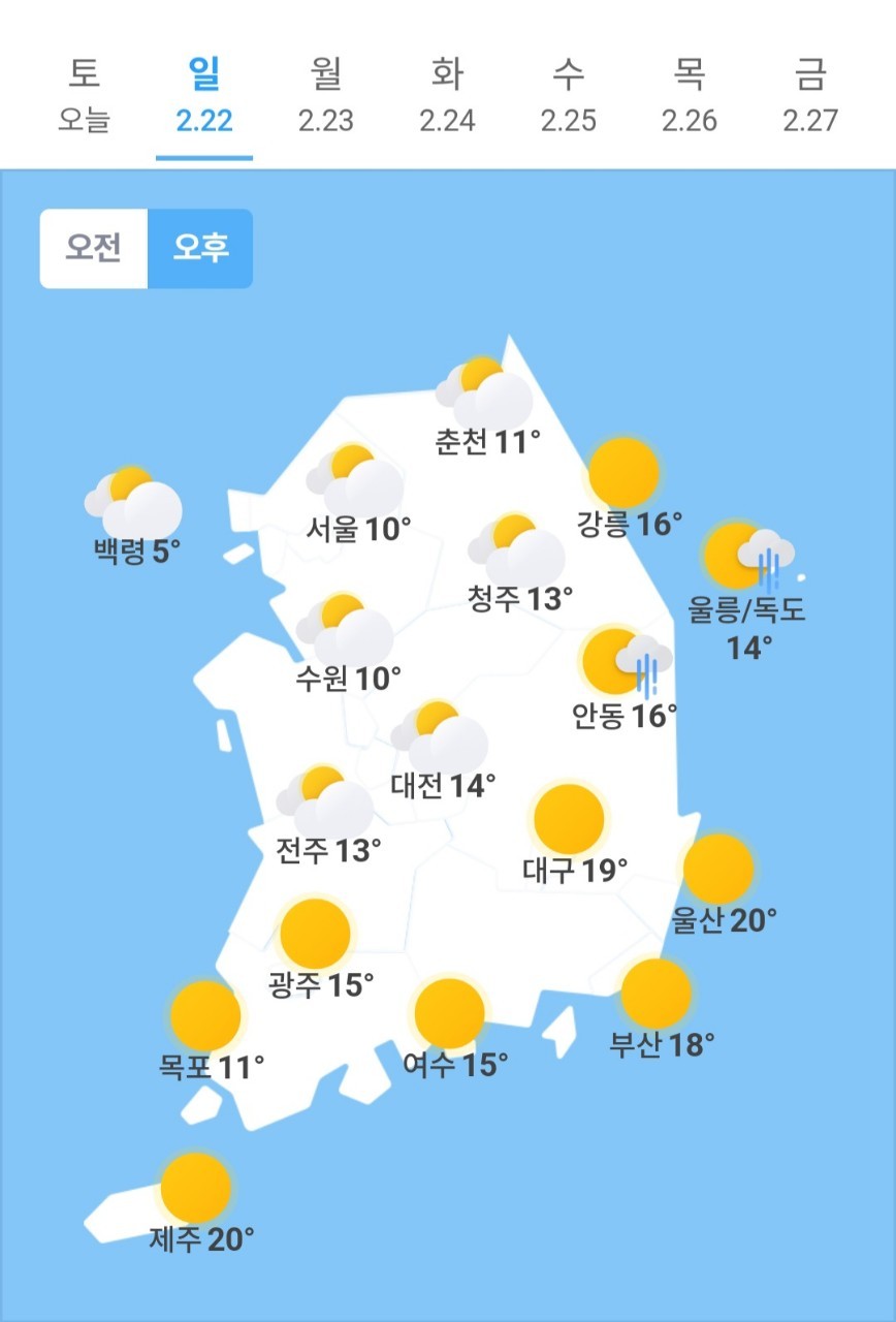 오늘의 날씨 🌞☔️☃️ , 2026년 2월 22일 일요일